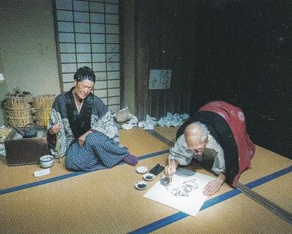 江戸東京博物館の東側・・清澄通りを南にすすみ、総武線のガードをくぐって100程先の東京東信金の脇の細道を西にいくと、小さな稲荷神社がある。この辺りに、江戸時代武士が馬術を訓練するための榛(はんのき)馬場のあった場所で、この馬場に祀られていたのが、この榛稲荷神社という。 本所に生まれた北斎は、生涯で90回以上も転居を繰り返したといい、この神社の近くに北斎が住んでいたことは特定できるという。 ![]() 当時の様子を伝えるのが、「北斎仮宅写生」で、絵を描く北斎と、娘が描かれているが、北斎美術館に展示されている「北斎アトリエ」では、それを蝋人形で再現している。* 墨田区商店街連合会発行の「すみここ」より、コピー。 |