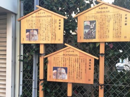安田庭園を見ることができず、、夜の部の集合時間には時間がありすぎたので、前回訪れた「回向院」の南側に足を延ばしてから、両国橋の東側・・・片葉の葦の場所と、「ももんじや」・・に向かうことにした。 国技館前をすぎてから、隅田川テラスにでる。 テラス沿いの壁には、隅田川や両国橋。回向院かんする浮世絵が数多く描かれており、当時の様子を想像しながらのんびりと歩ける場所である。 両国橋の下をくぐり、、堅川との合流点の手前で、、テラスから街中へもどる。 |