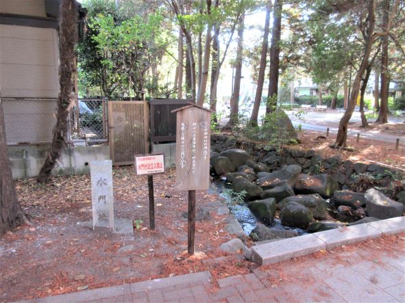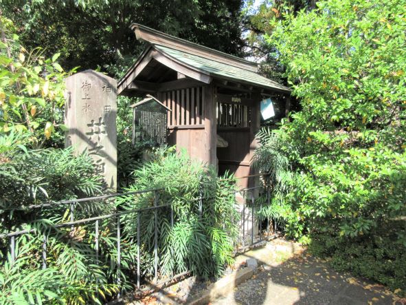 | 北西端の木陰に、「御茶ノ水」がある。 徳川家康がこの池の湧水を関東随一の名水とほめてお茶をいれた という伝説から、その名がついたという。 現在は湧水減少のため、地下水をポンプで組み上げているという。 |
