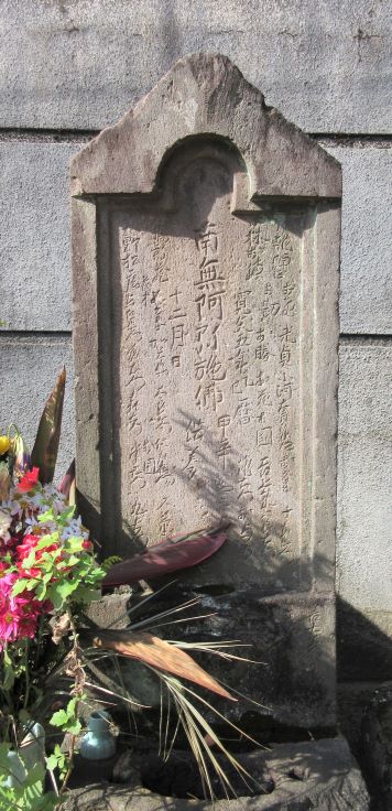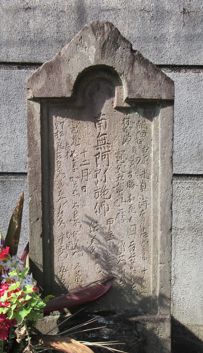 山門の手前に石塔群が並んでいる。 寛文5年(1665)建立、高さ117cm,幅39.5cm,厚さ13cmで、「南無阿弥施仏」 「甲辛」ときざまれている。「甲辛」は「庚申」の意味だと、説明文にある。 その右にある庚申塔(右写真)は、一般的な三猿青面金剛の庚申塔で、亨保4年(1719)の建立である。 境内には 安永2年(1773)に鋳造された市内で最も古いという梵鐘がある。 |