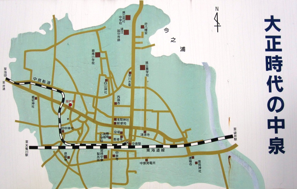 | 600mほど進んだ右手の中泉公民館の広場の前に、説明板が立ち、国分寺あとから駅周辺にかけての、江戸時代と大正時代の地図が描かれている。 「大正時代の中泉」 「江戸時代の中泉」 ・・・ 善導寺の南東の「御陣屋」と描かれており、家康の中泉御殿はこの辺りにあった。 |