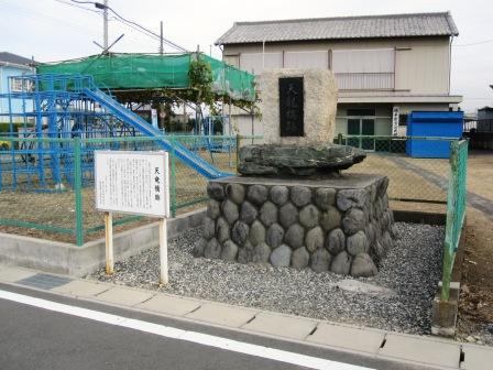 | そこから真っ直ぐに北に向かい、天竜川の渡船場に向かう。 100mほどの先を左折すると、「天龍橋跡」の石碑が立っている。 長い間渡船での通行であったが、明治7年(1874)船橋が完成し、明治9年になり木橋に架けかえられた、という。全長646間(1,163m)巾2間(3.6m)。昭和8年(1933)鉄橋が完成するまで利用された。 元にもどり北に進み、国道1号を歩道橋と高架ガードをくぐって越えた。 |