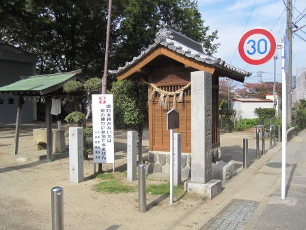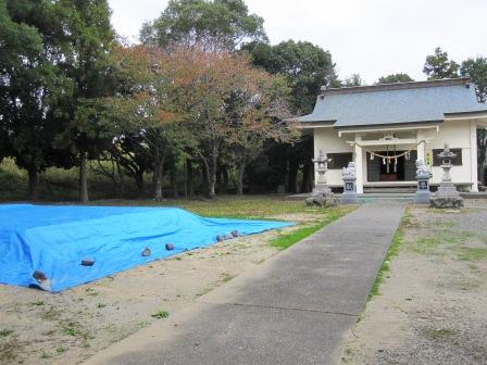 由緒によれば、孝謙天皇の時代(749~58)の創建といい、池田村全体の鎮守であった。 喧嘩相撲が有名で、境内に土俵がある。(青いシート) |