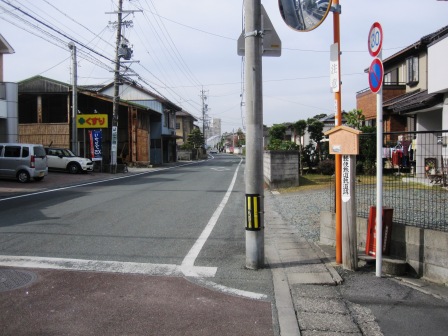 | 神社から数百m西に進んだところに、信号のある十字路があり、旧東海道は北に向かう。 その手前に長森立場があった。 説明板には、山田与左衛門家の「長森かうやく」が、切り傷やあかぎれに効能があるとして、人気を博していたという。 十字路の先には天竜川の土手が見えてくる。 |