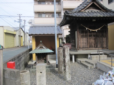 | 信号から先は、古い街並みが続く豊田地区池田であり、延長5年(927)のころから天竜川の渡船場として交通の要所となっていた。 古くは今よりも西側を天竜川が流れていたといい、頼朝の上洛した時は川を越え池田宿に泊まったという記録がある。 江戸時代池田村に渡船権を独占的に与え、保護したので、池田渡船ともいわれた。 池田は、間の宿として・・・天竜川の川越の宿・・として栄えた。 右手には寛政10年(1797)の秋葉山常夜燈が立つ。 |