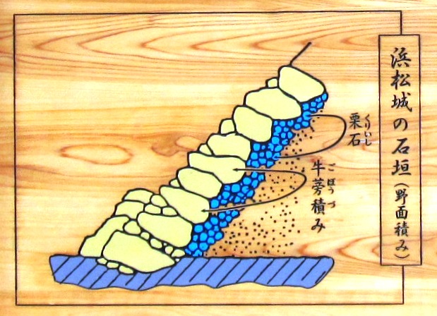 | 三方ヶ原の戦いで敗れた家康だが、武田軍はそのまま浜松城を無視して西に進軍、しかし信玄が病に倒れ撤退したのち、天正14年(1586)駿府城に移るまでここで16年間を過ごした。江戸時代に入ると、家康ゆかりの譜代大名が城主となった。25代の城主のうち5人が老中になるなど、幕府要職に 天守から三方ヶ原方面を見る→ 今の天守閣は昭和33年(1958)の建造で、天守台はあったが、江戸時代の天守閣の絵は残っておらず、それ以前にあったかどうかははっきりしない。 石垣は、当時の面影をよく残してあり、堅く崩れにくい構造になっているという。自然石を上下に組み合わせて組む方法で、「野面(のずら)積み」といって慶長年間以前はよく用いられていたという。 |