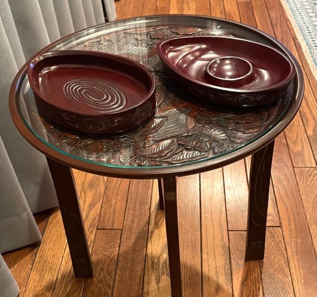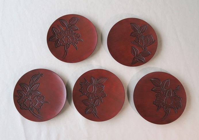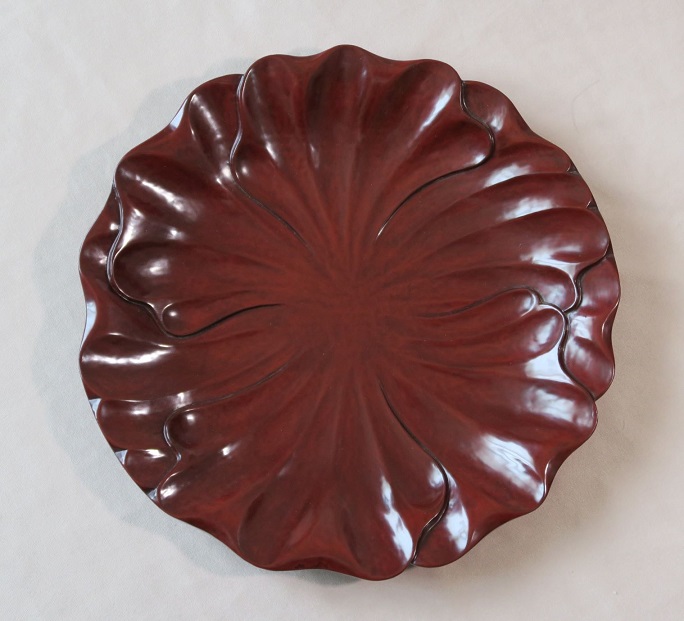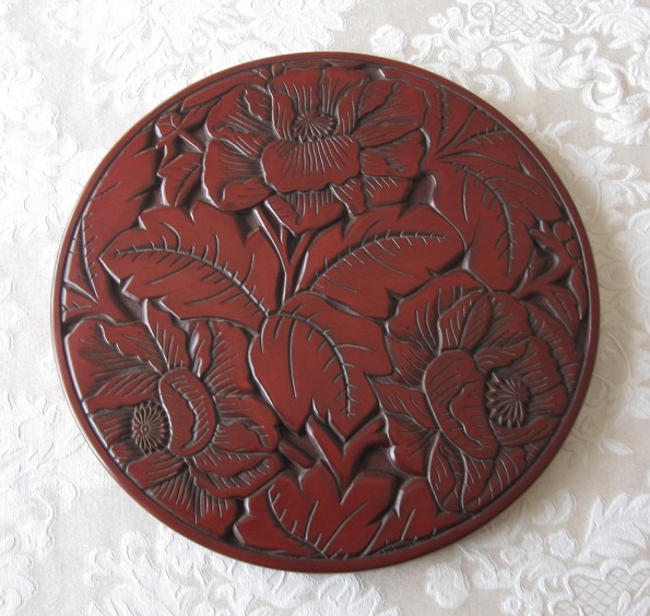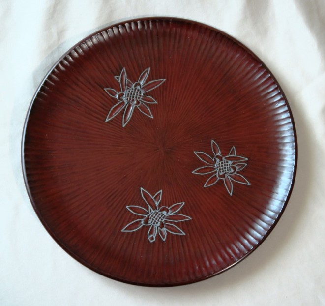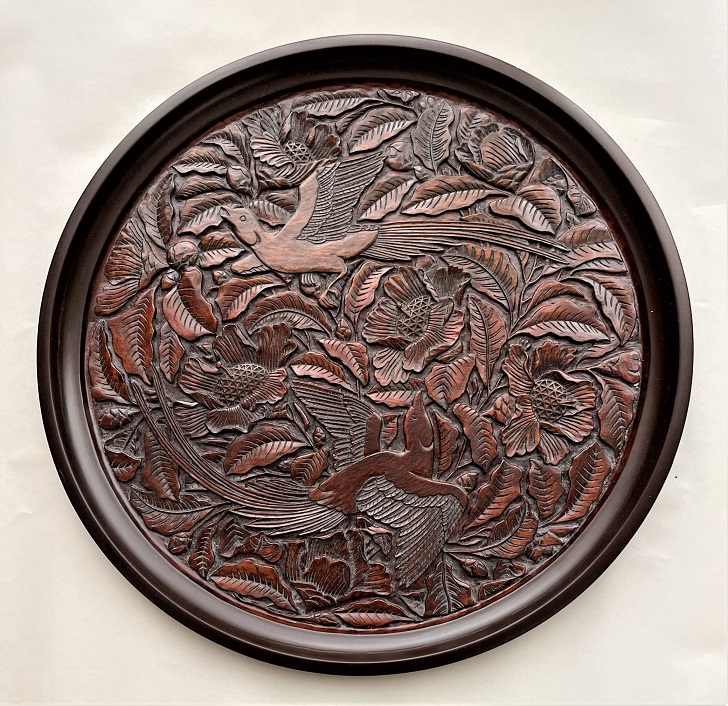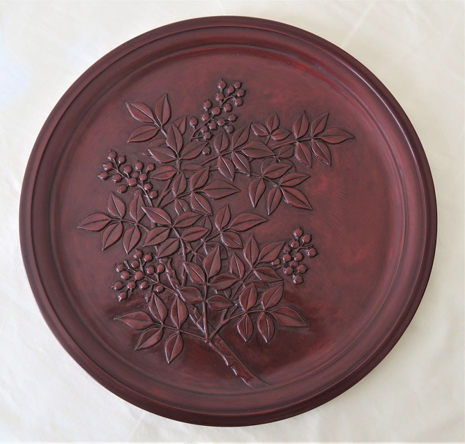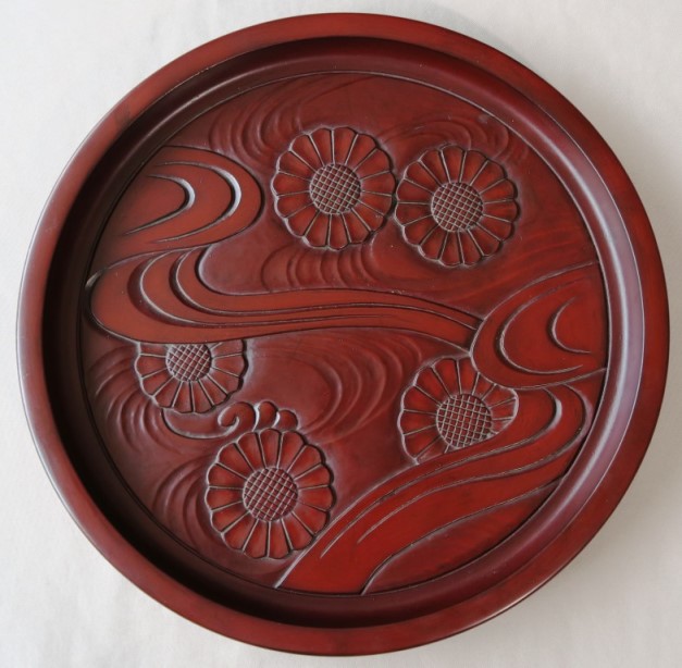 | 202209 | 椿と尾長鶏 丸盆 39cm 拭き漆 |