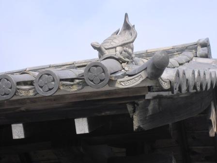 ←藩主太田田氏の家紋=桔梗紋のある軒瓦 少し先に小さな川があり、十王橋をわたる。 この付近に掛川宿の西番所があったという。 |