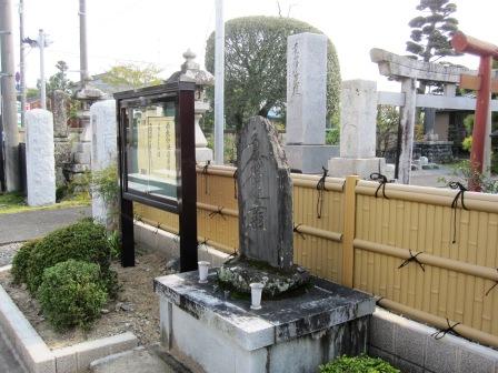 | その先で緩い上り坂となり、松並木となる。国道1号と合流し、歩道橋を渡ると、「遠州鈴ヶ森」の白いサインが右 江戸鈴ヶ森と同じ刑場であった 「妙法無縁之萬霊」と刻まれた題目塔が立つのみである。 |