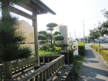| 二つ目の四辻の手前60mの右側の民家の脇に、文字が薄くなった鉄柱が立ち、木原一里塚跡とようやく読める。ここが本来の塚の場所で、その先四辻の角に、復元された一里塚がある。 塚の反対側に、木原畷古戦場400mという標識があり、寄り道をする。 元亀3年(1572)鷲巣の久野城を攻めた武田信玄は、ここ木原に陣をはり、浜松城を守る徳川家康と衝突した。信玄側が勝利したが翌年信玄が没し、天正3年(1575)長篠の戦い後、家康方が優勢となった。 |