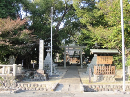 創建不詳、昔は郡辺神社といわれ、延喜式神明帳にも記載のある神社。 説明板には、七つの塚(森)の伝えとして、日坂宿の怪鳥を退治する武士の伝説が記されている。 参道入り口の木柱に本殿裏から戦国時代の城跡、久野城がきれいに見えるとあったが、住宅と高架道路のためよく見えず。 |