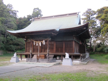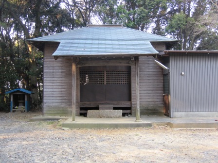 | 200mほど先右側に鳥居があり、参道奥の道路を越えて、社殿がある。 創建不詳。正徳5年(1715)現在地に移転、嘉永元年(1848)本殿建立という。(一間社流造り) |
