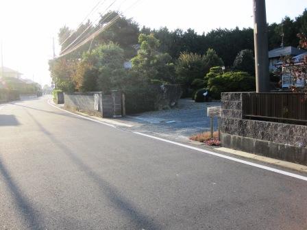 | 下り坂の途中右手のアパートの間から、小山と石柱がわずかに見える。阿多古山一里塚である。 坂を下り広い車道と合流する手前に、東木戸跡 |