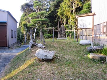 | 社務所の左に古い土塀が残っている。手前に神宮寺跡の石碑が立つ。 明治の廃仏毀釈までは、ここに神宮寺が立っていたという。 |