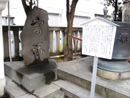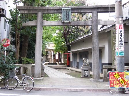 | 日本銀行の北側の広い通りが、江戸通りで、東北方向にほぼ真っ直ぐ進む。この先、宝町、小伝馬町、馬喰町などのなじみのある交差点が続く。 昭和通りとの交差点-本町三丁目-の一つ先の細い道を右折すると駐車場の端にまわりに木も一本もない鳥居と建物だけの神社が立っている。 |