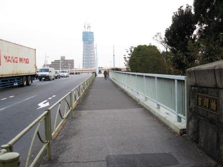 | 江戸通りを北上して、言問橋となる。 名前の由来は諸説あるようであるが、話として面白いのが「伊勢物語」 にある 在原業平 の詠んだ『名にし負わば いざ言問はん都鳥 わが思ふ人はありやなしやと』の古歌に由来しているという説である。橋を向島側に真っ直ぐ進むと、「墨田区業平」 という地名がある。 ただ実際に業平の渡ったとされるのは、ここから更に北にある白髭橋付近にあった「橋場の渡し」である。 遠くには、東武伊勢崎線の業平橋駅脇に建設中のスカイツリーが見える。 |