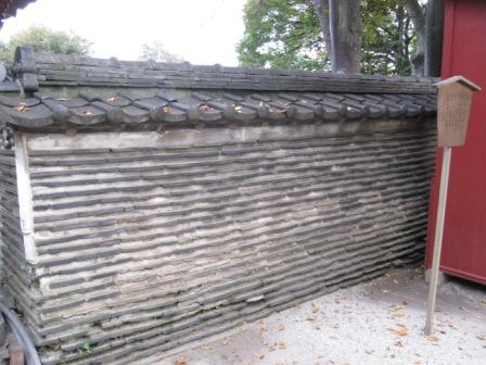 | 言問橋交差点から道は二又に分かれ、左に行くのが旧日光街道・奥州街道で、江戸時代初めに開かれた。旧道は右に進む。 200mほど先左に待乳山と呼ばれる小高い丘があり、待乳山聖天がある。浅草寺の支院で本龍院といい、創建は推古天皇9年(601)、十一面観音が聖天歓喜尊天となって現れたのを祀ったといわれる。江戸時代には東の眺望の名所と称された。、二股大根と巾着の組み合わせが紋章が珍しい。 境内には、銅造の宝篋印塔がある。天明元年(1781)に鋳物師西村和泉守が製作したもので、屋根型の笠を持つ。また、江戸時代の名残をとどめるものとして「築地塀(ついじへい)」が保存されている。 |