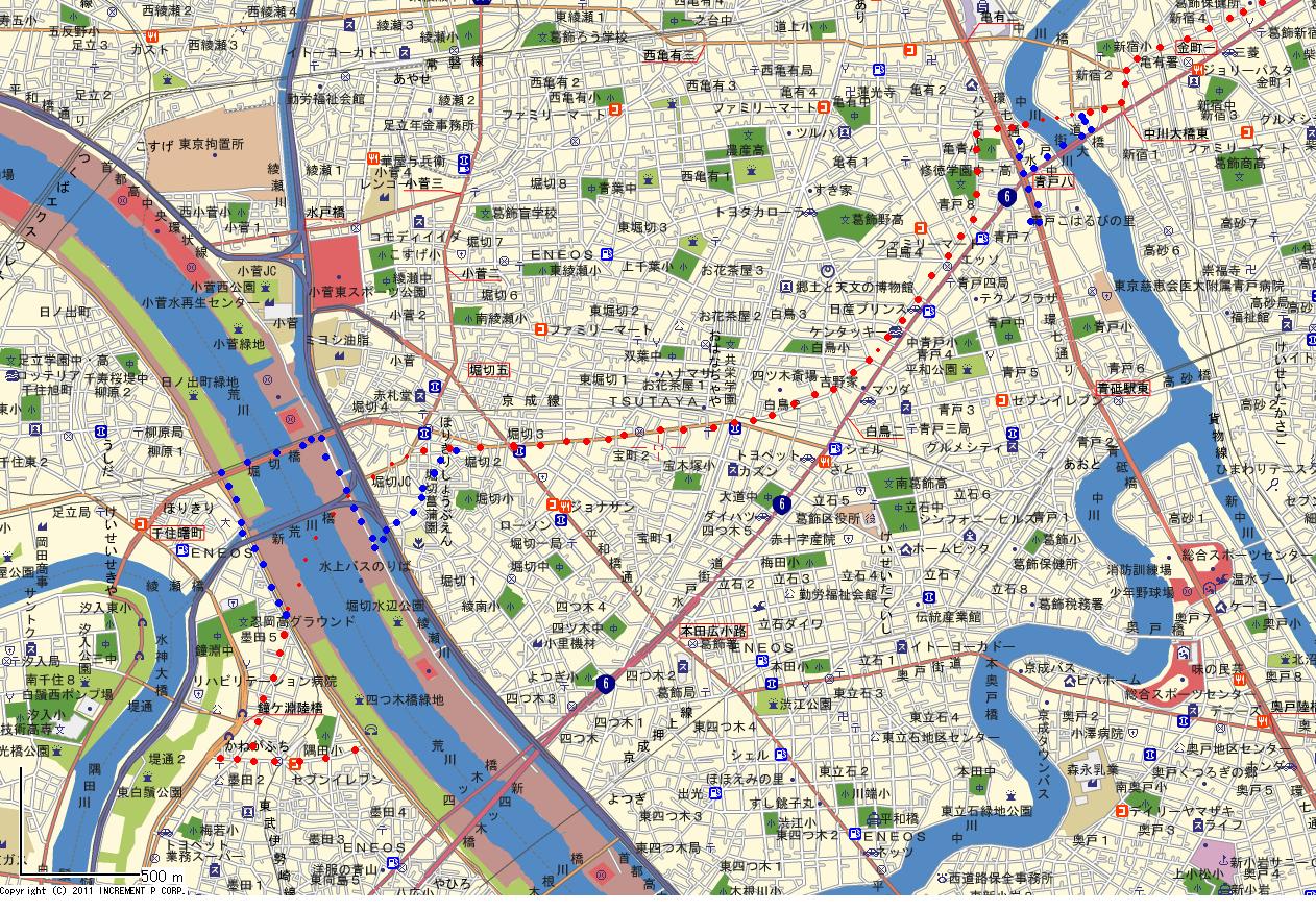 | 京成線お花茶屋駅前から京成線を渡り東側の広場にでる。 江戸時代2本の用水路があった所で、川は曳舟川と呼ばれており、広い公園となっている。 ここからは、京成線の北側の道を北東に進む。国道6号−現水戸街道の西側を並行している道で、途中で6号線に出て迂回せざるを得ないところもある。 道なりに進み、青戸八丁目に入ってからは真北に向かう。 右側に亀青小学校があり、旧道はその先から東に向かい、今の環七通りを越えて中川を渡ったようである。 |