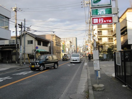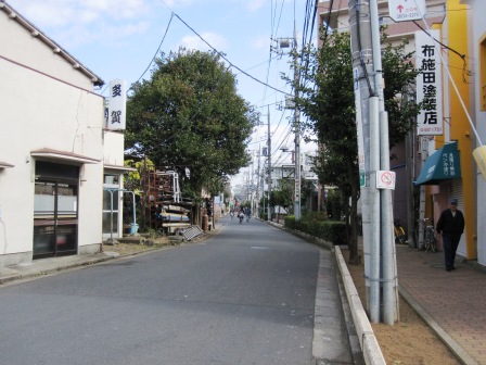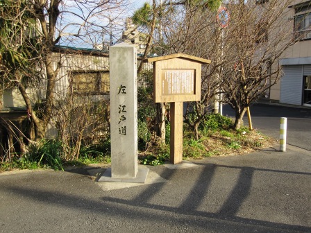 | 日枝神社の北側にまわり、細い道を少しいくと、桝形の道とぶつかる。 ←桝形の道を、北から日枝神社方面をみたところ この桝形の道には宿場町の面影がある。安政年間の長屋門が残っていたというが今はない。 ここから、南に佐倉まで行く佐倉道が分岐していた。水戸街道はこの先、金町・松戸・取手と進む。 東へ100mほど進み、浄心寺の脇を北にすすむと、道路拡張工事中の信号のある三叉路に出る。 旧水戸街道である。 |