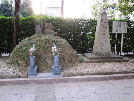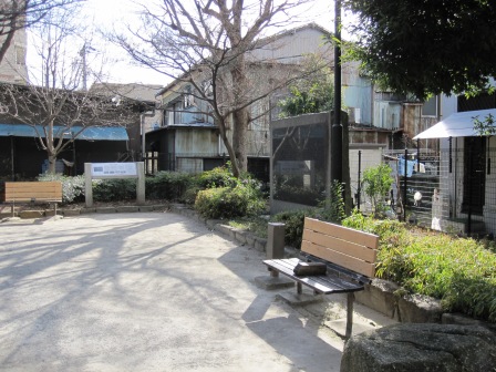 | 御殿山公園の南側に小さい広場があり、発掘された葛西城の説明板がある。葛西地域は、秩父平氏の流れをくむ葛西氏によって治められ、一部は「葛西御厨」として伊勢神宮に寄進 葛西城の築城は15世紀中頃と推定され、天文7年(1538)の国府台合戦で北条氏綱により落城、徳川時代には跡地に将軍の鷹狩の際の休憩として「青戸御殿」が建てられたという。 また、青砥藤綱の居館跡という伝承があり、木陰に石碑が立っている。 |