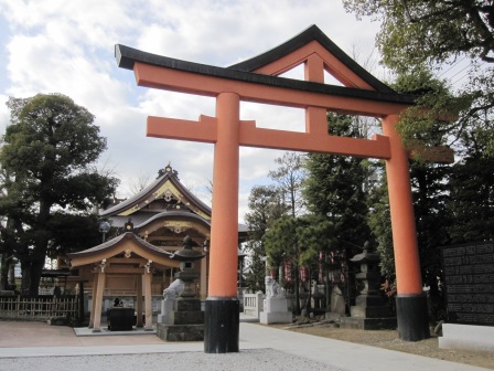 永禄2年(1559)のころの創建という。江戸時代は新宿の鎮守であった。 境内にはひときわ目立つ鳥居が立っている。「山王鳥居」と言われ、鳥居の笠木の部分の上端に合掌のように破風を付したもので、日枝神社・日吉大社などに見られる鳥居である。 |