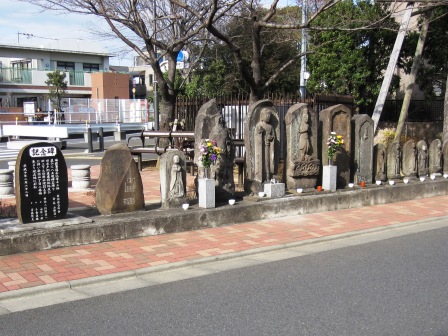 途中、亀青小学校の東側に宝持院がある。 天養2年(1145)の開創、天文7年(1538)の国府台合戦で焼失、その後再建されたという。 境内には、下小合村の領主として続いた松浦氏の子孫で、寛延元年(1748)長崎奉行に抜擢された松浦河内守信正の墓がある。 |