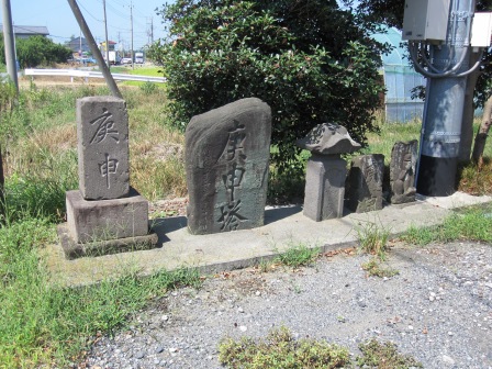 | この先の野中交差点で、南からきた国道254号と合流し、そのまま西北に進む。まもなく天神橋をわたってすぐに、旧街道は国道から左に分岐する。200mほど進んだ突当りと、その先の民家の角に寛政12年(1800)の供養塔と庚申塔が建つ。 |
