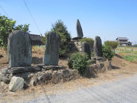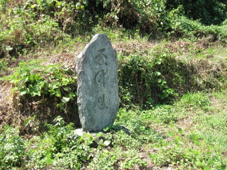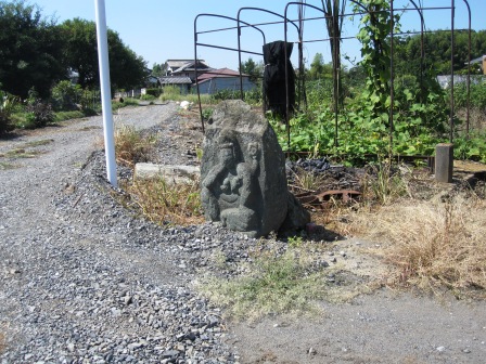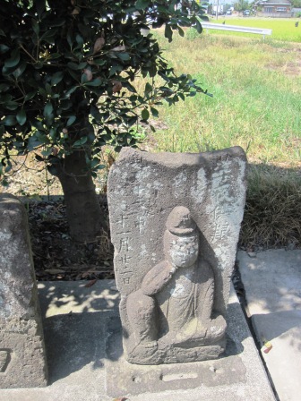| 少し先で二又となり、その角に如意輪観音が彫られた供養塔が少し埋もれて立っている。 ここを左に進み、その先でさきほど分かれた広い道に合流する。 直ぐ右側に、庚申塔と彫られた大きな石塔と、天保14年(1843)の馬頭尊と大きく彫られた石塔がある。 美里町白石の大仏集落に入る。 |