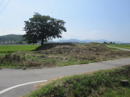 | 神社境内から北にいくと「魔珂の池」と呼ばれる池があり、その西側に二子塚という古墳がある。 この辺りには他にも多くの古墳があるという。 更に2kmほど北にいくと、「水殿(すえどの)瓦窯跡」という、鎌倉時代に瓦を焼いた窯跡が保存されているというが、今回はスキップした。 |