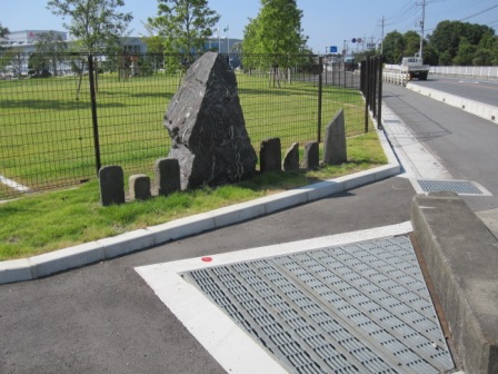 | まもなく、右側に広大な「エーザイ」の敷地が広がる。左側には西に進む広い道があらたに整備されている。 その角の小公園に広木一里塚の説明板が立つ。ここには樹齢400年の榎があったというが、今は枯れて、一里塚と刻まれた大きな石碑や馬頭尊の石塔が立つのみである。 旧街道は、陣街道と呼ばれここから北を流れる小山川(身馴川)に向かって西北にすすんでいたという。 今は、新たな工場が並び道路も付け替えられ、「陣街道」とよばれた面影は全くない。 |