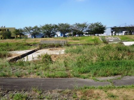 | 旧街道の道筋をたどるべく川にむかっていくと、工場が途切れた先に古い砂利道が残っており、川の土手迄行くことができた。 そこから、一里塚跡まで戻るつもりであったが、たまたま川の水が少なく、歩ける箇所があったため、運よく対岸に辿りついた。 対岸には、北から南下してきた旧街道の跡らしい道がある。 |