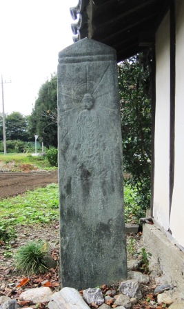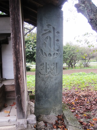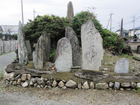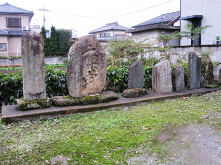 | その先の植竹交差点で県道22号線を渡る。この辺りから、西の神流川(かんながわ)を越えるまでのルートにいろんな説があるようだ。 芳賀氏の本によると、この交差点を過ぎて少し進んだ所から二つのルートが考えられるというが、八高線の少し南側にある出雲神社の前を通るルートを行くことにする。 その前に、交差点から100mほど北に行った墓地の手前の石塔群を見に行く。寛政12年(1800)の供養塔や、文字庚申塔など多くの石塔が集められたようだ。 |