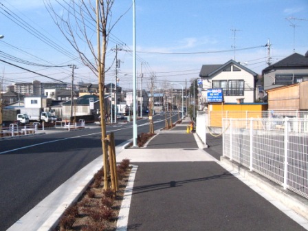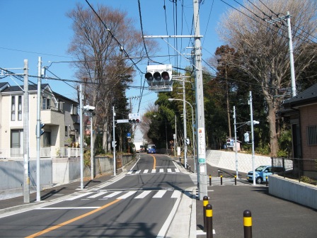 | 途中二手に分かれる道を北西に向かう。台地常は一部畑や梅林が残るが、急速に住宅地として開けているところである。 やがて南北に一直線の伸びている広い道路があり、そこを越えていく。 (この道路は海軍道路と呼ばれ、瀬谷中学校から北の16号線まで南北に3kmに渡っており、桜が植えられている。) |