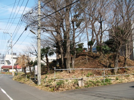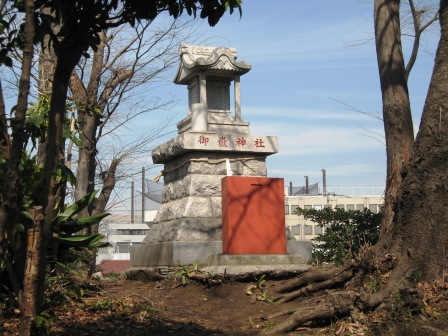 | ゆったりとスペースをとった歩道橋で、246号線を渡って、北に進むと、右側ビルの隣に樹木の生えている大塚と呼ばれる高さ4mほどの塚がある。 頂上には、御獄神社と刻まれた真新しい祠が立っている。 |