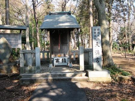 | 北にほぼまっすぐ進み、町谷十字路の西から北に向かっている広い 金森天神山市民の森が右側にあり天満宮がある。 入口に「江戸時代、には、この付近を小名名『時宗久保』と呼ばれていた(金森文化遺産保存会)」と書かれた杭が立っている。 |