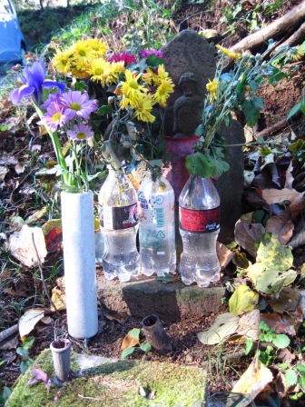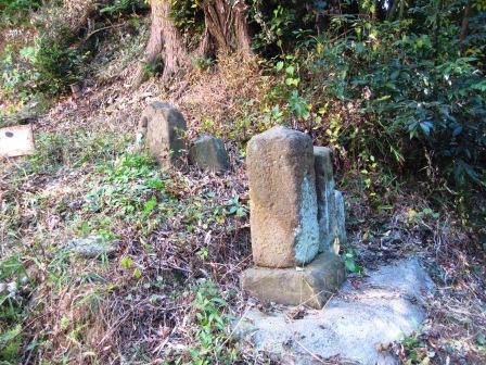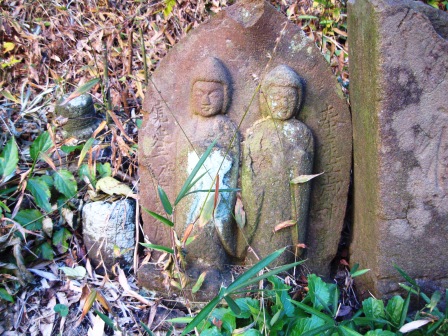 | 西北への下り坂となり、途中に嘉永5年(11)の銘のある石地蔵など石仏数体がある祠が立ち、また道端の小さい石仏にも |