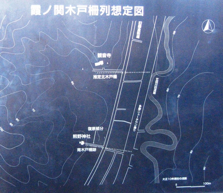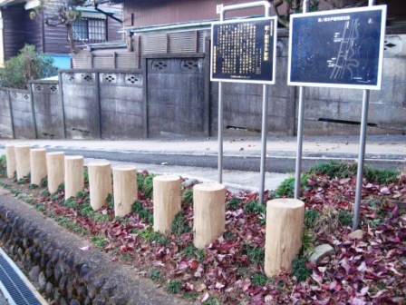 | ここは建暦3年(1213)に鎌倉街道に設けた木柵の関所の、南木戸があった所で、霞ヶ関と呼ばれていた。 熊野神社の参道に沿って木戸と柵跡が発見された。