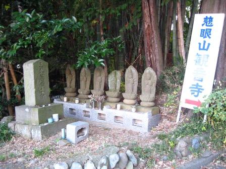 | その坂道の右側に観音寺がある。このあたりは、往時 処刑場であったといい、関所での不審の者が捕えられ処刑されたものという。 左手には、石仏の六観音像がある。 |