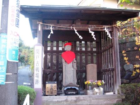 その先200mほど行くと左側に地蔵堂があり脇に関戸古戦場跡とかかれた標柱がある。 |
