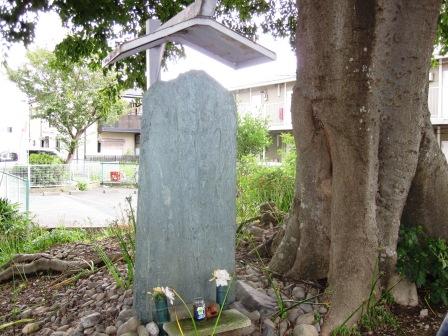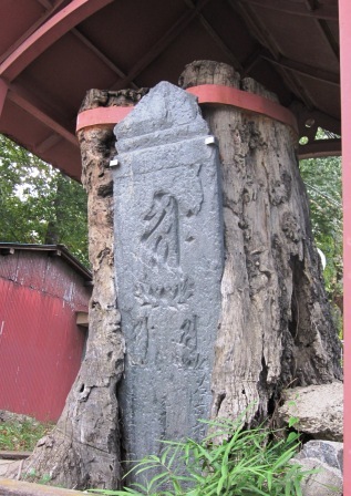 | 踏切を過ぎるとすぐ左に八雲神社がある。説明板によると、天王宮として祀られていたが、明治以降八雲神社と改称した分梅(分倍)地域の鎮守である。 境内右の道の脇には、元応3年(1319)に建てられた板碑(樫の木に食い込むように立っていたので「抱き板碑」とよばれる)がある。 表面は風化しているが、大蔵近之なる人物が泣き父親の「道仏」の十七年忌の供養のために建てたものと解釈されているという説明がある。 |
