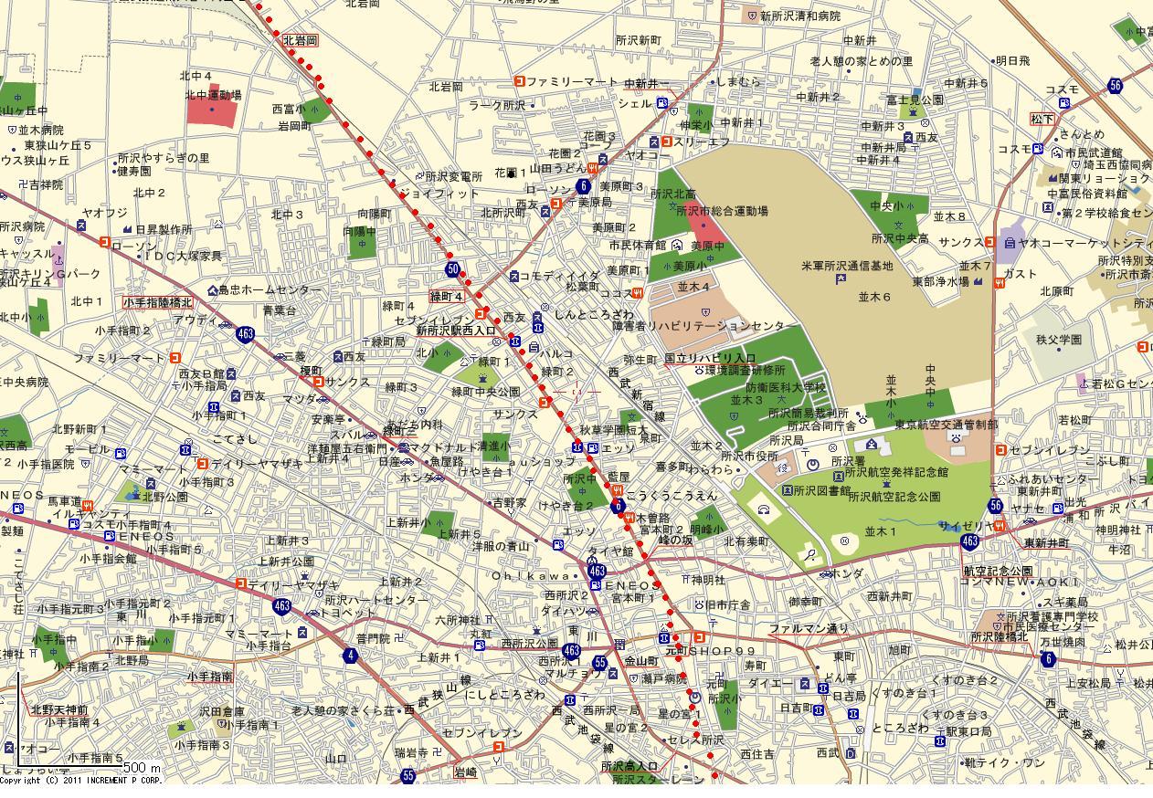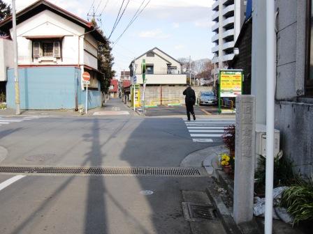 | 多摩川を越えてから真北に進んできた「上の道」は、所沢からは向きを北西に変えて、ほぼ直線的に入間川(狭山市)まですすむ。 |