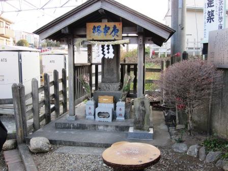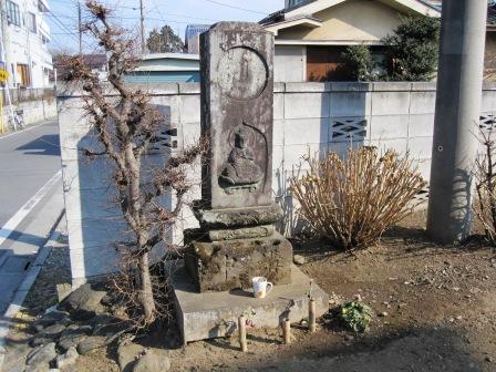 | 越えたところに、祠があり、「庚申塔」と大きく 寛政11年(1799)の銘があるが、説明板によると、近くに建立されていたものが、西武線開通の折りここに移されたという。 |