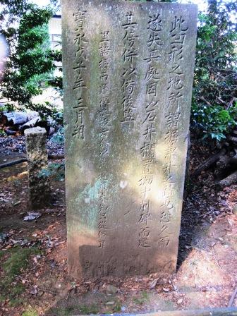 | バス道に戻る途中北側に、樹木の多く茂り広い境内をもつ神明社がある。神社の由緒によれば、大和武尊が東夷征伐の 境内に明治17年(1984)の建立の「富士講記念碑」がある。 所沢の富士講は江戸時代後期のころ成立したという。 |
