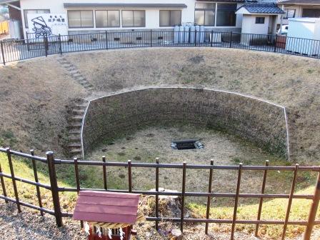 直径26m、周囲70m余り、深さ11.5mという大規模な漏斗状の井戸である。井戸に降りる道は上部で階段状で、中央部では曲がり道、底近くでは回り道になっており、このみちの形状が名前の由来となっているという。井戸は、建仁2年(1202)に掘られたという説と、平安時代の古道沿いにあるため平安中期に、武蔵国府の手で掘られたと考えられるという。 この井戸が、前掲の歌にある「堀兼の井」であるともいわれている。 |