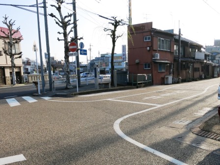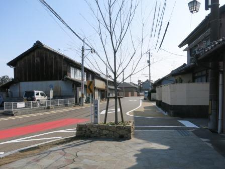 | すぐ先の枡形で左に曲がり、100mほどで左からの道路と合流する。 その広場には、新加納一里塚跡の石柱や新加納の案内板が建っている。。 |