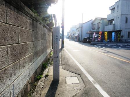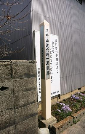 ![]() 次の信号から100m程左に六軒町公民館があり、左手には秋葉神社が祀られている。六軒町の町並みが続くが、このあたりには六軒茶屋と呼ばれる立場があったという。その先の左手に入る手前の建物の前に、「中山道一里塚跡」の標柱が立っている。 道の向かい側には竹林寺がある。 |