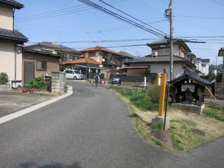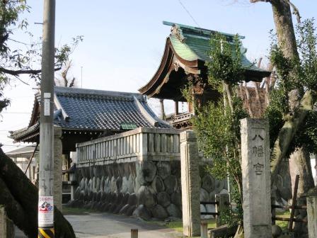 すぐに名鉄名古屋線の踏切と茶所(ちゃじょ)駅がある。このあたりで旅人に茶屋を設けて茶を振る舞ったところから、茶所と呼ばれたという。 踏切を越えてすぐ左側に長い黒塀に囲まれた広い屋敷・家屋がある。あとで調べたら岐阜市景観重要建造物に指定されている「森家」住宅であった。少し先 にも、長屋門のある民家がある。500m程歩く戸、右側に八幡神社があるが、中山道を背にして建っている。なぜ かと思ったら、この先で名古屋方面からくる伊勢道が合流しており、そちら側に向いているのであった。 |