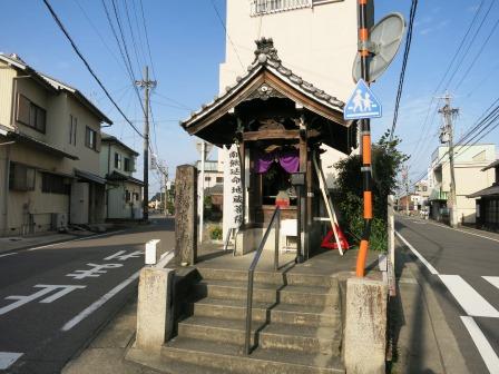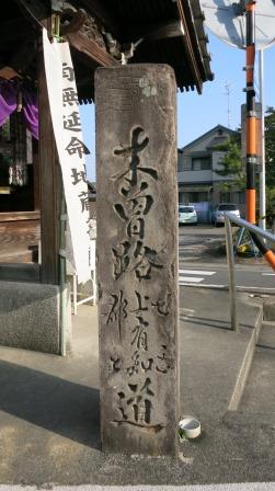 ![]() すぐ先の右からの合流地点に、延命地蔵菩薩が祀られた堂が立ち、前に大きな道標がある。「左(指さし印) 伊勢名古屋ちかみち 笠松・・・」 「右 西京道 加納・・・」 [右 木曽路 上有知 郡上 道」と大きく刻まれており、明治9年((1876)建立とある。 |