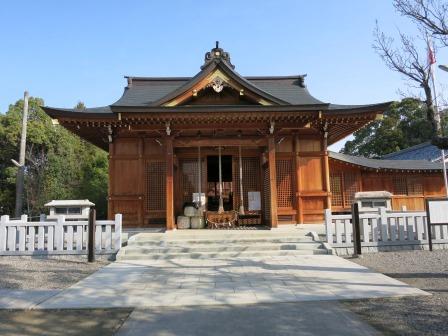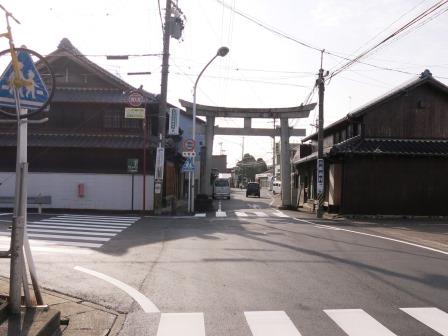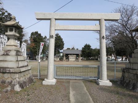 しばらく行くと交通量の多い広いバス道路に合流する。 数百mで新境川をわたり、市民公園の脇を進む。![]() 1km以上、進んだ先に、鳥居の奥から本殿まで広い境内を持った六軒神明神社がある。 左手には馬頭観世音菩薩の幟がはためいている。 |
