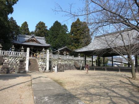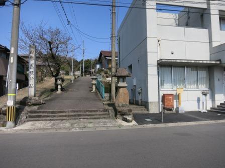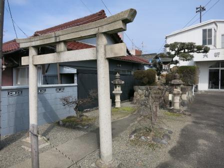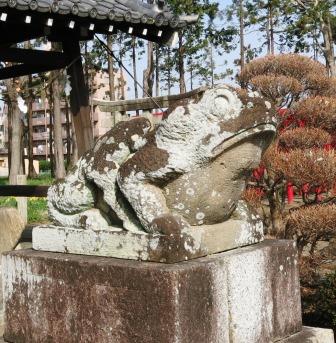 少し先に日吉神社の鳥居がある。寄り道となるが(100m北)、案内板に珍しい狛蛙があるということで、参拝する。 大津市の山王総本宮の分祀社で、平安時代の創建という。境内には瓢箪池があり多数のガマ蛙が生息していたという。 毎年4月に「げえろ祭り」がおこなわれている。 →拝殿前の狛蛙。台座には昭和14年(1929)とある。 |
